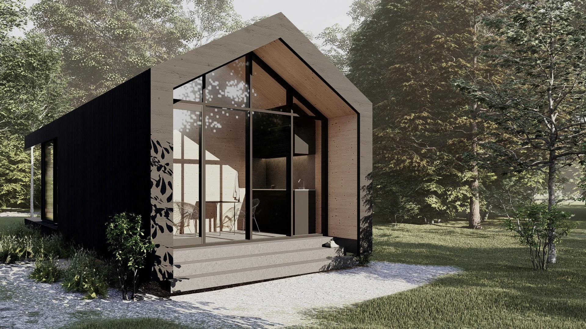 Der Auftraggeber hatte eine klare Vision für das Therapiestudio in seinem weitläufigen Garten: Ein nachhaltiger Holzbau sollte es sein. Es entstand ein minimalistischer, klarer Entwurf eines Holzhauses mit Satteldach und ruhigem Innenraumkonzept.